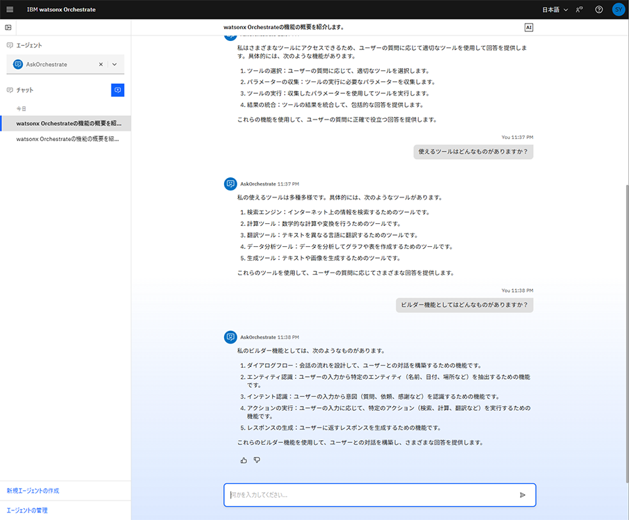 単一のチャット画面で、AIエージェントがユーザーの要望を理解し、最適なアクションやスキルを自動で選択します。必要に応じて複数エージェントが連携し、メール送信から求人作成のような複雑作業まで段階的に進めます。基盤モデル(Foundation Model)としてIBM Graniteなどを活用でき、業務向けの推論と安全性を両立します。