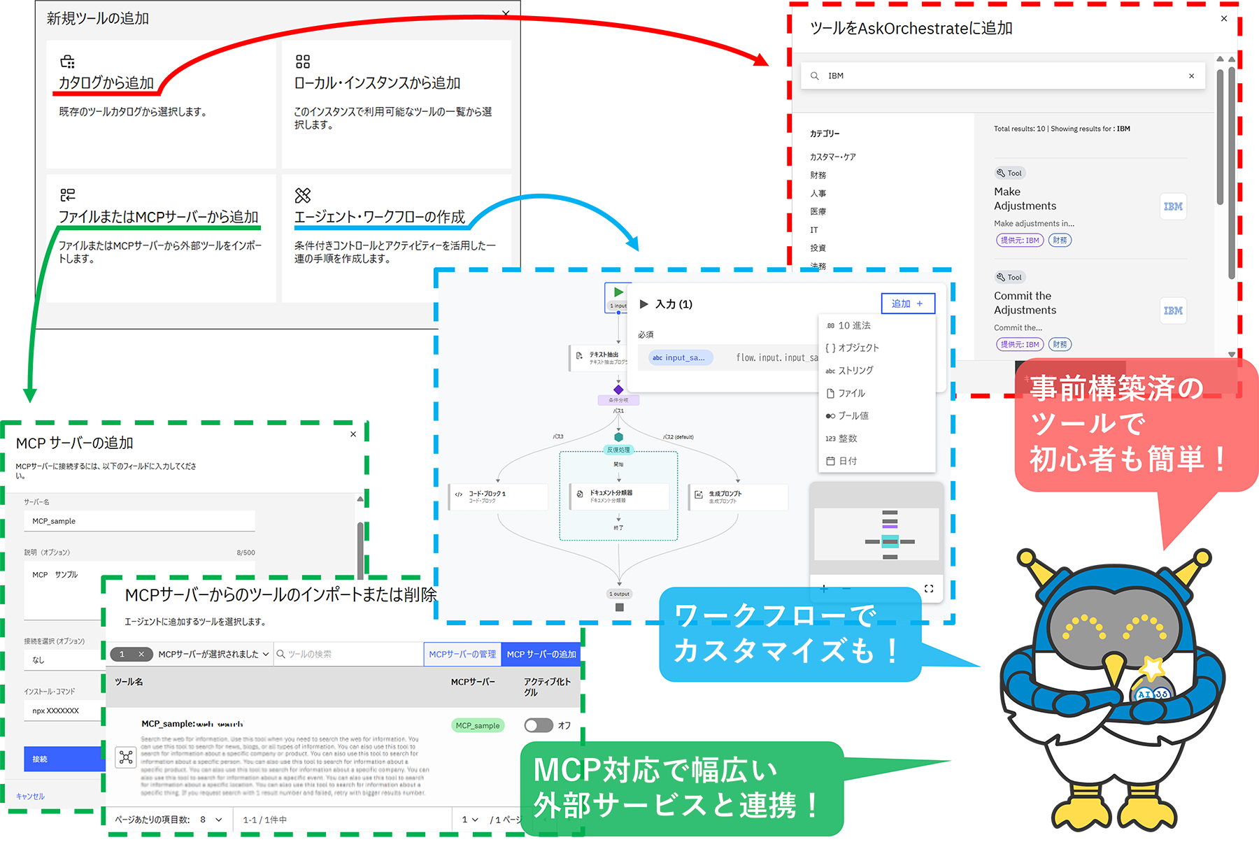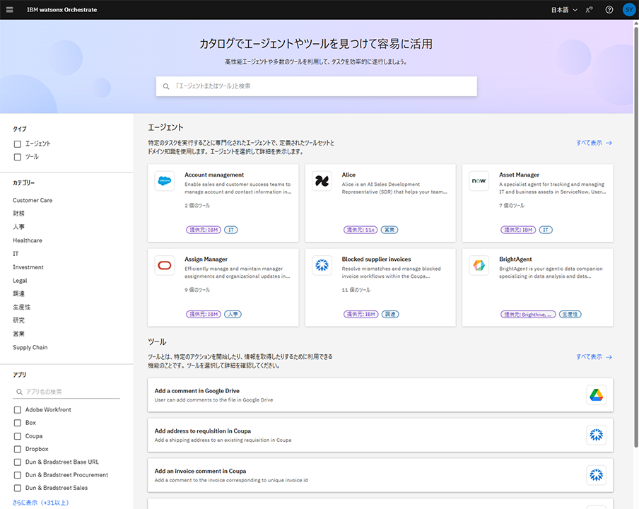 「ツール」は、AIが外部システムで処理を行うための機能パーツで、メール送信やCRM更新などを自動化します。watsonx Orchestrate ではカタログから選んで業務アプリと連携、簡単にムダな作業を削減して本来の業務に集中できます。 多くがノーコードで構築でき、現場主体で継続的な業務改善も可能です。