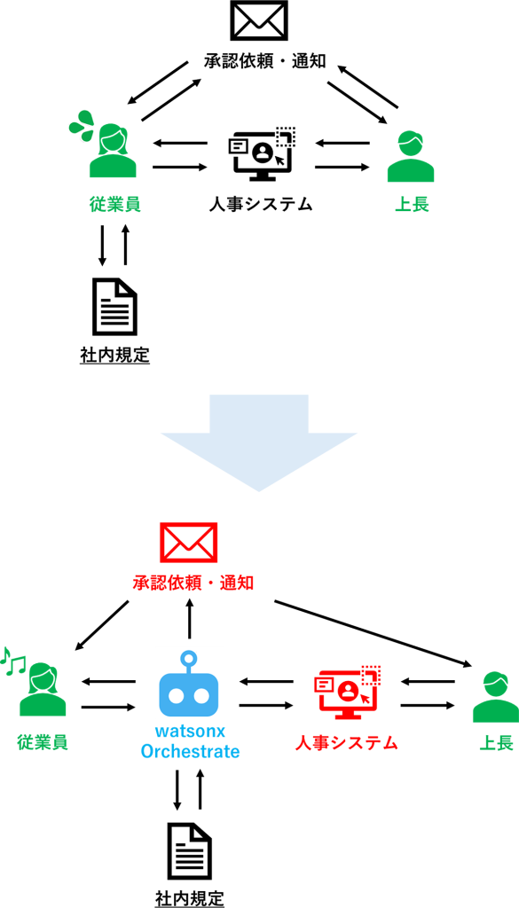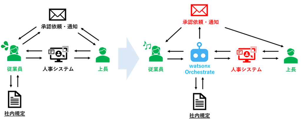 ユーザーが用件を伝えると、AI社内規定を参照して内容を判断し、必要に応じて社内システムへ自動でつなぎます。たとえば「通勤手当を変更したい」「有給を取りたい」と言うだけで、規定チェックから申請書の作成、上長への承認依頼、さらに記録・通知までを一気通貫で完了。これまでの「探す・書く・待つ」といった手間は、会話で「伝えるだけ」に変わります。 その結果、抜け漏れや手戻りが大幅に減り、ユーザーは事務処理に追われることなく、本来の業務判断や創造的な仕事に集中できるようになります。